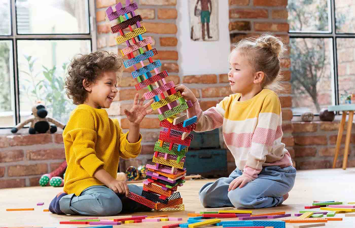 • Zwei Kinder bauen jeweils eigene Türme mit Bausteinen, schauen sich aber gegenseitig zu.
